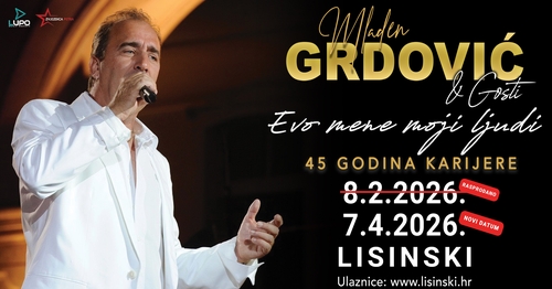 Kralj dalmatinske fešte Mladen Grdović, koji obilježava 45 godina sjajne pjevačke karijere, rasprodao je svoj svečani koncert najavljen za 8. veljače 2026. godine u Koncertnoj dvorani Vatroslava Lisinskog!