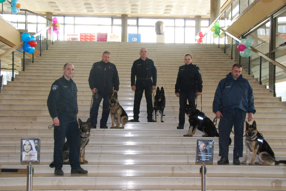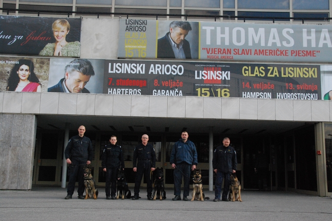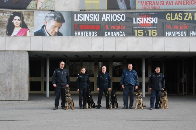 Centar za obuku vodiča i dresuru službenih pasa Ministarstva unutarnjih poslova RH izvodio je vježbe sa službenim psima za detekciju droga i eksploziva u prostoru Velike i Male Koncertne dvorane Vatroslava Lisinskog.