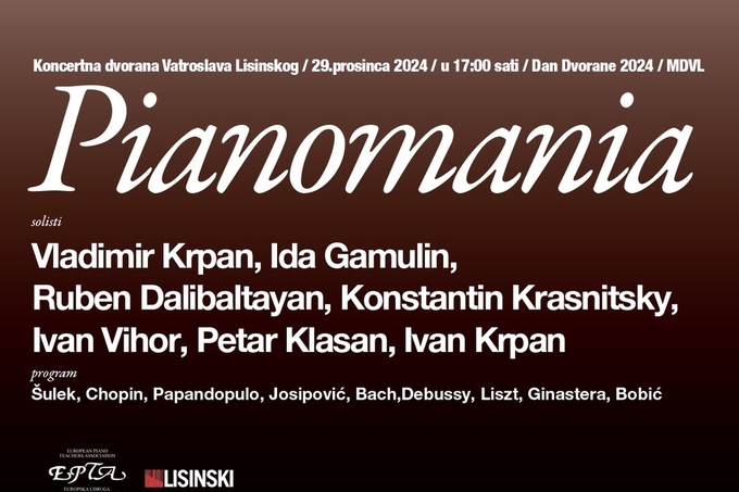 Nesvakidašnja „Pianomania“ na Dan dvorane bit će „sudar“ legendi i mladih virtuoza. Nastupaju Vladimir Krpan, Ida Gamulin, Ruben Dalibaltayan i Konstantin Krasnitsky te „mladi izazivači“ - Petar Klasan, Ivan Krpan i Ivan Vihor.